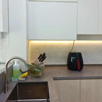 This kitchen project is a celebration of texture and premium materials, thoughtfully crafted to blend aesthetics and functionality. The textured tile backsplash serves as a focal point, adding depth and character to the design while complementing the clean lines of the cabinetry. Its intricate surface captures light beautifully, creating subtle visual interest and bringing a sense of warmth and personality to the space.